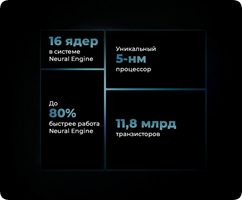 Это первый процессор iPhone с применением 5‑нанометровой технологии. Более быстрый, более мощный, более эффективный. Его передовые компоненты по размеру сопоставимы с атомами. В нём на 40% больше транзисторов, поэтому процессор работает быстрее и при этом ещё более экономно расходует заряд аккумулятора. А новый процессор обработки сигнала позволяет снимать видео в стандарте Dolby Vision - это недоступно даже профессиональным кинокамерам, не говоря уже о других смартфонах.
