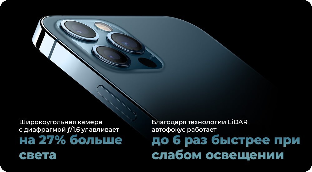 Снимать в "Ночном режиме" теперь можно и на широкоугольную, и на сверхширокоугольную камеру. Фотографии, сделанные при слабом освещении, становятся намного качественнее. Благодаря технологии LiDAR становится возможным Ночной режим для портретов. А широкоугольная камера способна улавливать на 27% больше света, поэтому чёткие детализированные снимки будут получаться и днём, и ночью.
