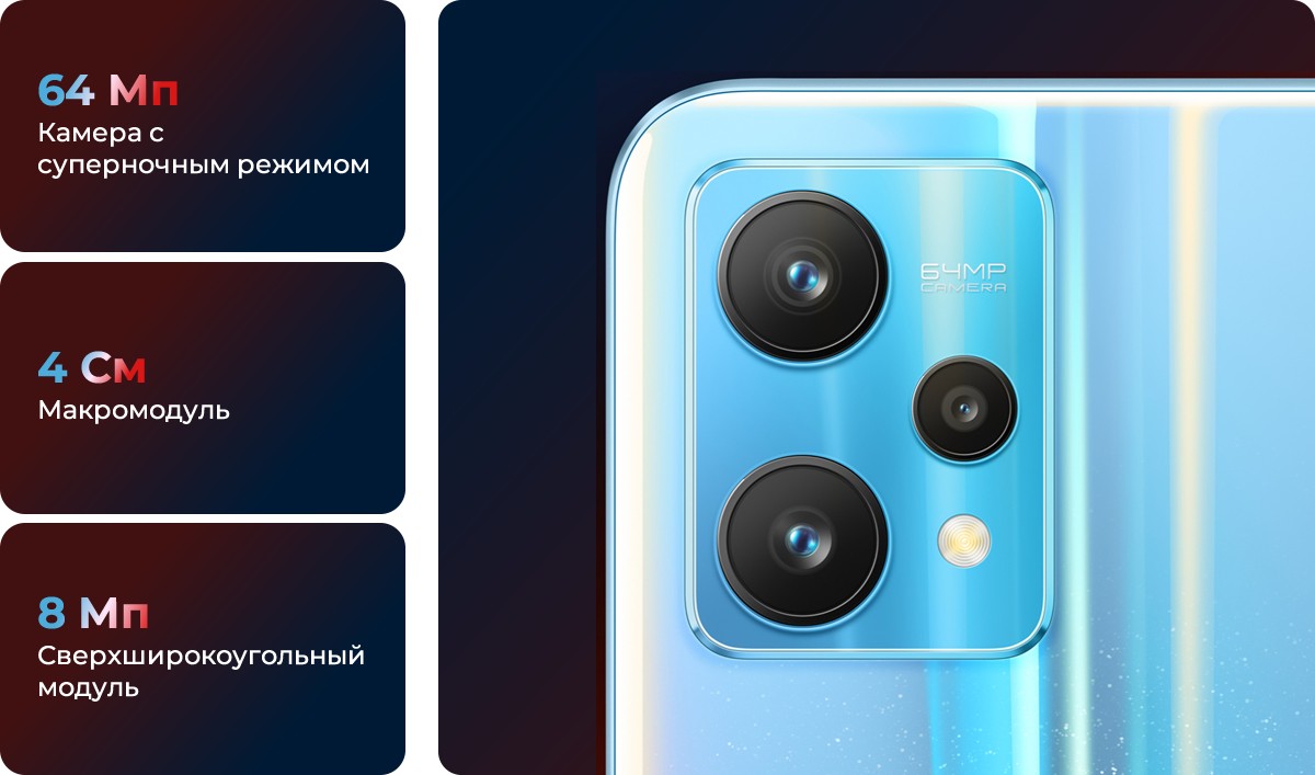 Realme 9 Pro оснащен 64-мегапиксельной камерой с высоким разрешением, поэтому вы сможете делать четкие и красивые фотографии даже при плохом освещении. Но зачем ограничивать свое творчество только одной камерой? Поместите больше предметов в кадр с широкоугольным модулем 8 Мп и проводите экстремально близкую съемку с помощью макрокамеры с фокусным расстоянием 4 см.