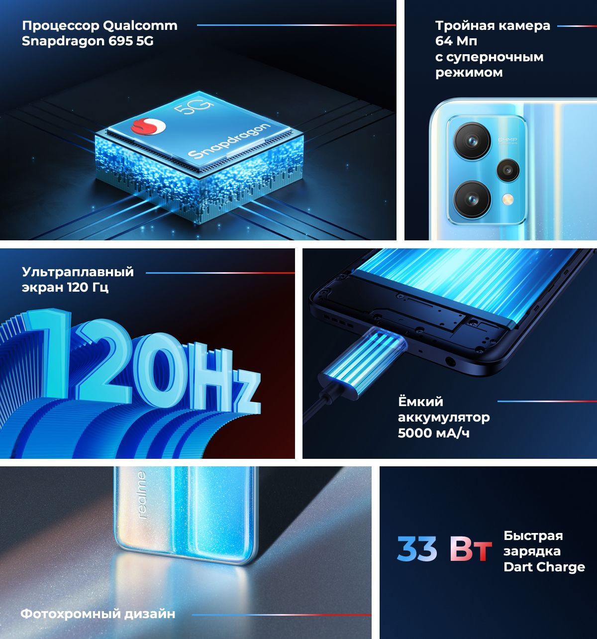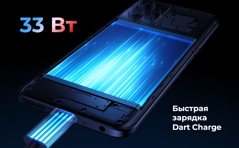 Realme 9 Pro емкостью 5000 мА/ч с помощью быстрой зарядки Dart Charge мощностью 33 Вт.