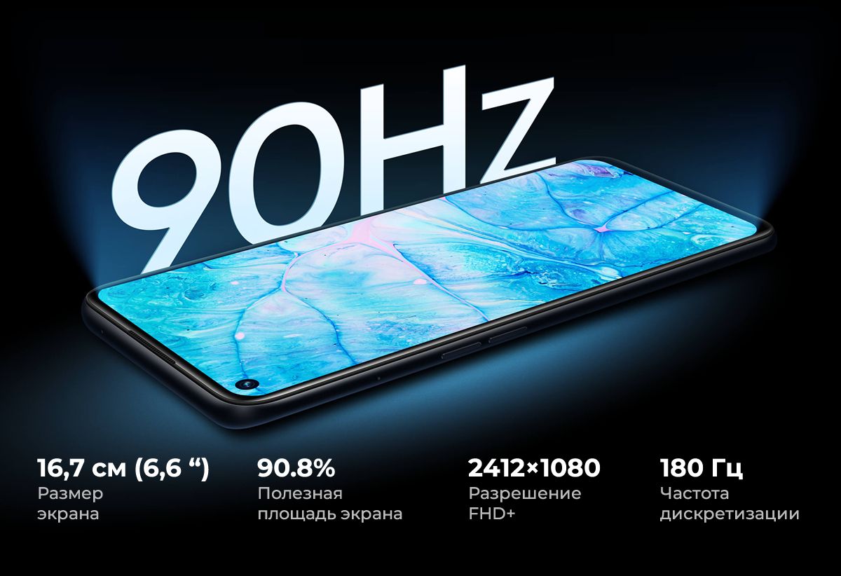 Большой экран 6,6 дюйма (16,7 см ) c частотой обновления экрана 90 Гц обеспечивает плавный визуальный опыт и высокое разрешение. Пять автоматических уровней динамической частоты обновления экрана повышают общую энергоэффективность смартфона.