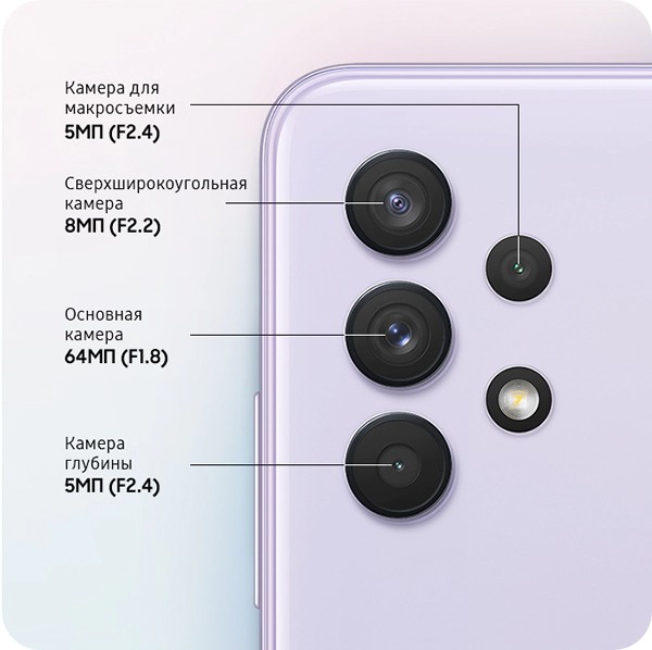 Четыре AI камеры Samsung Galaxy A32 поднимают уровень качества фото на новую высоту. Делайте сверхчёткие снимки на 64 Мп основную камеру. Расширьте поле зрения камеры с помощью сверхширокоугольной 8 Мп камеры. Управляйте резкостью камеры с 5 Мп датчиком глубины или снимите детали объекта съемки с помощью 5 Мп макрокамеры.
