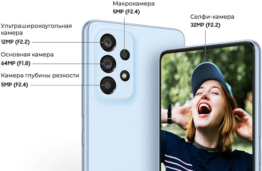 Четыре камеры на Galaxy A53 5G выводит фотографию на новый уровень. Камера 64 Мп с технологией OIS поможет сделать четкие живые снимки, ультраширокоугольный объектив — расширить угол обзора, камера глубины резкости — настроить фокус, а макрообъектив — снять всё до мельчайших деталей.