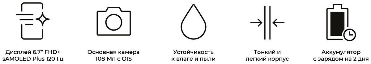 Дисплей FHD+ Super AMOLED Plus завораживает. Благодаря широкому 6,7-дюймовому дисплею Infinity-O и ультраширокоугольной камере 108 Мп снимки поражают своей реалистичностью. Наслаждайтесь превосходным отображением данных даже в самый солнечный день с яркостью до 800 нит и сниженным уровнем синего света благодаря технологии защиты глаз Eye Comfort Shield.