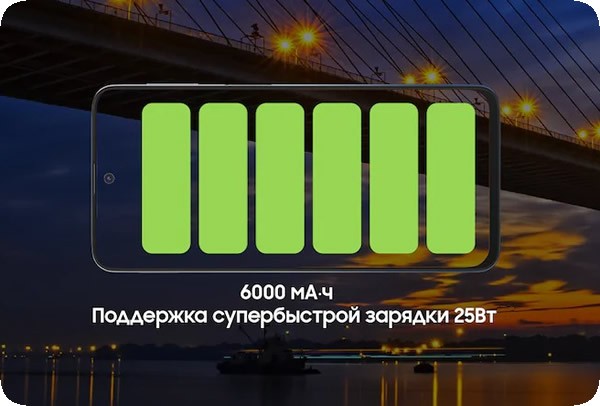 Невероятно мощный аккумулятор 6000 мА/ч с быстрой зарядкой 25 Вт для продолжительной работы в течение дня.