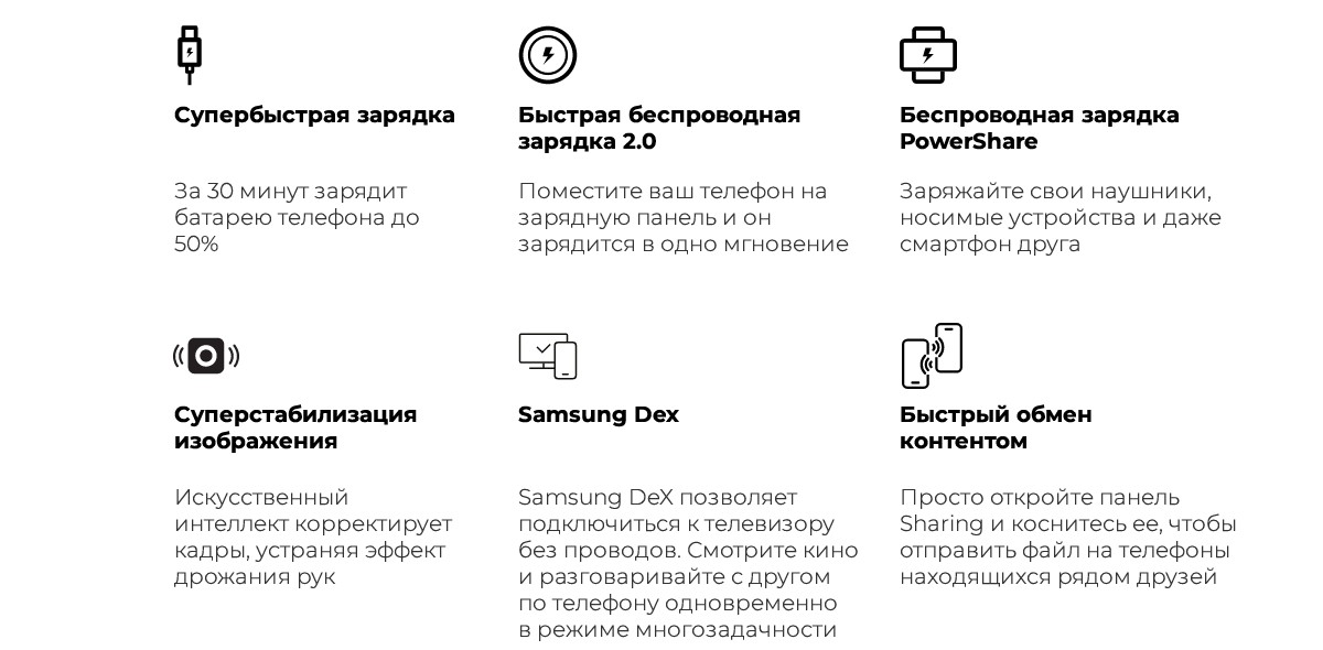 | Параметры аккумулятора | поддержка быстрой беспроводной зарядки Fast Wireless Charging 2.0, поддержка беспроводной зарядки Wireless PowerShare, поддержка быстрой зарядки, 25 Вт |