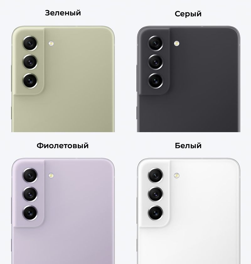 Samsung Galaxy S21 FE 5G выпущен в четырех популярных оттенках – от изящного и в то же время насыщенного зеленого и фиолетового до вечной монохромной классики – серого и белого. Палитра, в которой вы точно найдете оттенок, идеально дополняющий ваш стиль.