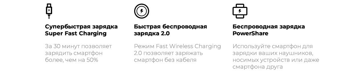 | Параметры аккумулятора | поддержка реверсивной беспроводной зарядки, 9 Вт, поддержка быстрой беспроводной зарядки Fast Wireless Charging 2.0, поддержка беспроводной зарядки, 15 Вт, поддержка беспроводной зарядки Wireless PowerShare, поддержка быстрой зарядки, 25 Вт |