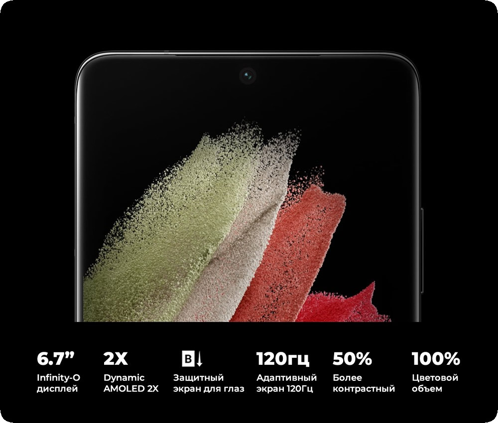 6,8" суперплавный 120 Гц Infinity-O дисплей с технологией Dynamic AMOLED 2x обеспечивает потрясающее качество изображения со 100 % объемом цвета и улучшенной контрастностью. Оптимизация частоты обновления в зависимости от просматриваемого контента снижает нагрузку на батарею. Совместимость с пером S Pen обеспечивает уникальную точность управления. Чтобы обеспечить комфортный просмотр, технология Dynamic AMOLED уменьшает интенсивность «тяжелого» для глаз голубого света, не меняя цветов и оттенков на экране.