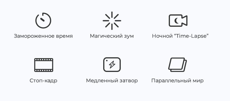 Поднимите свои видео на новый уровень, добавив 6 фильтров эффектов на выбор: "Магический зум", "Медленный затвор", "Ночной Time-Lapse", "Замороженное время", "Параллельный мир" или "Стоп-кадр". Не требуется никакого профессионального опыта или дорогостоящего программного обеспечения для редактирования. Получите фантастические результаты одним щелчком мыши.