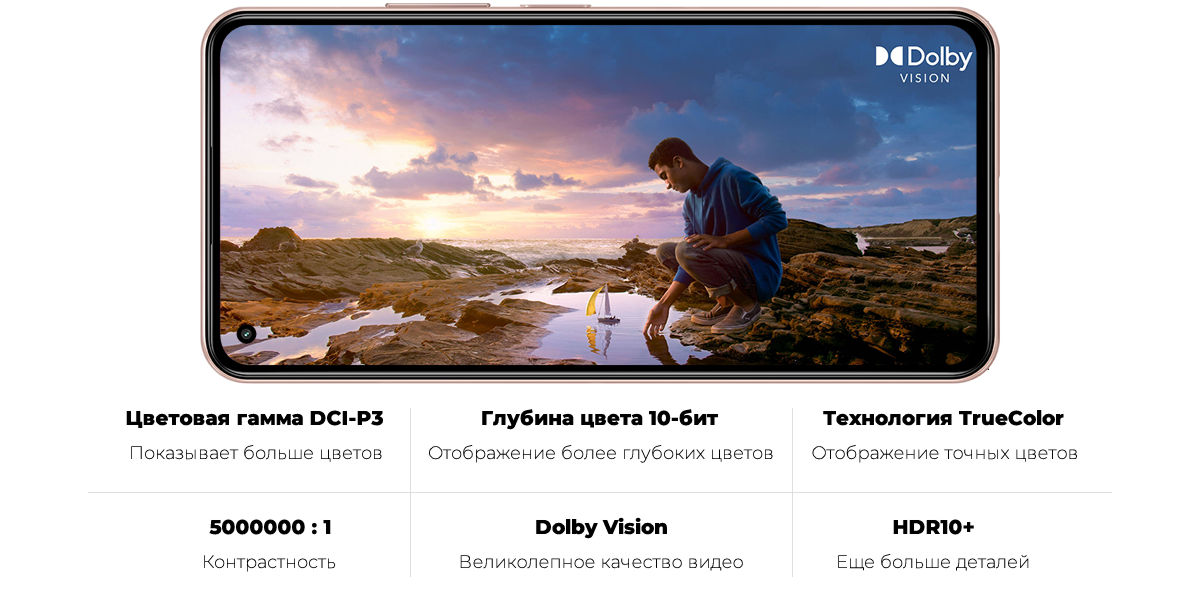 Оживите контент с помощью насыщенных цветов и высокой точности цветопередачи 6,55-дюймового AMOLED экрана с надежной защитой Corning Gorilla Glass 5.