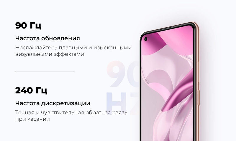 Частота обновления дисплея 90 Гц дает плавность в отображении динамического контента, а частота дискретизации касания 240 Гц более точную и чувствительную обратную связь при касании.