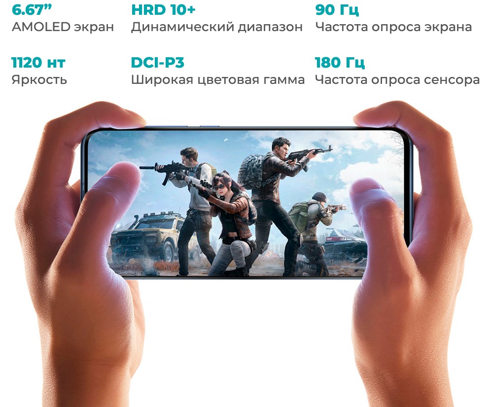 Размер экрана Экран 6,67", HDR10+, разрешение 2340 × 1080, яркость 1129 кд/м2, контрастность 5000000: 1. Идеальная матрица с идеальной передачей цвета. Супер-быстрый отклик. Попробуйте новые игры с новым качеством. Фронтальная камера вмонтирована в экран, отверстие под сенсор камеры 4 мм.