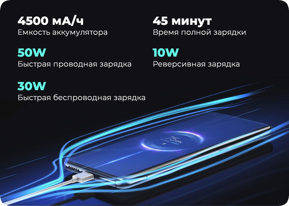 Аккумулятор 4500 мА/ч с быстрой зарядкой 50 Вт, технологии памяти LPDDR5 от 8 до 12 Гб, идеальная связь, Wi-Fi 6 802.11ax, Bluetooth 5.1, жесткий диск UFS 3.0.