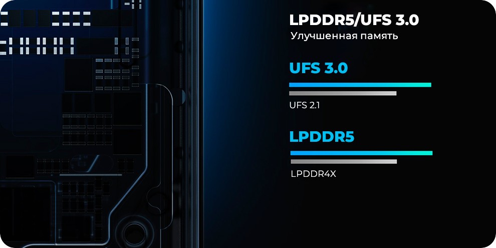 Высокоскоростная память формата LPDDR5 обеспечивает максимальное быстродействие процессора и моментальную загрузку любых объемом информации. Флеш-память стандарта UFS 3.0 обеспечивает мгновенный обмен информацией, на 20% быстрее, чем в предыдущих версиях.