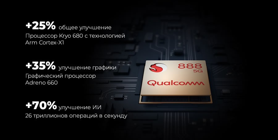 Ведущий процессор Qualcomm Snapdragon 888, созданный по 5-нм техпроцессу, полностью обновленный, графический процессор и искусственный интеллект, что делает его одним из самых мощных процессоров в эпоху 5G.