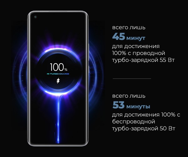 Проводная турбо-зарядка 55 Вт, беспроводная турбо-зарядка 50 Вт, 10 Вт обратная беспроводная зарядка.