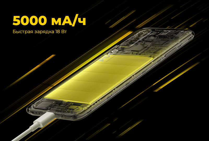 Быстрая зарядка 18 Вт и большая батарея емкостью 5000 мА/ч. Пользуйтесь Poco M3 Pro повсюду.