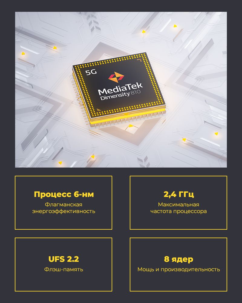 Процессор MediaTek Dimensity 810 был построен с использованием 6-нм флагманского процесса, получил восемь ядер с тактовой частотой до 2,4 ГГц и мощный графический видеочип ARM Mali-G57. Обновленная конфигурация обеспечивает существенное повышение производительности.